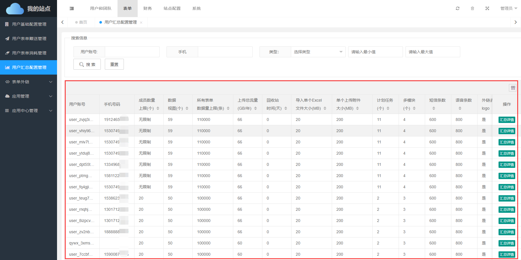 用户汇总配置管理管理页面显示每一个用户的具体性能参数。