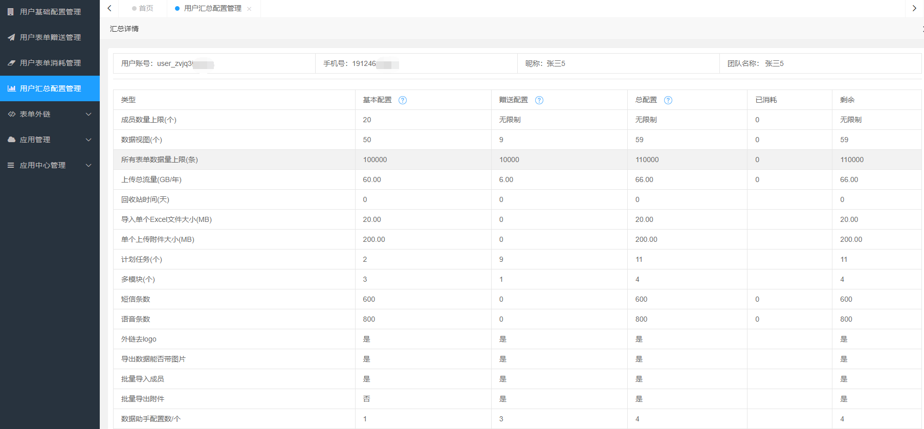 汇总详情中就是查看用户具体的消耗信息,可以列出基本配置、赠送配置、总配置、已消耗、剩余的每一项具体数值。