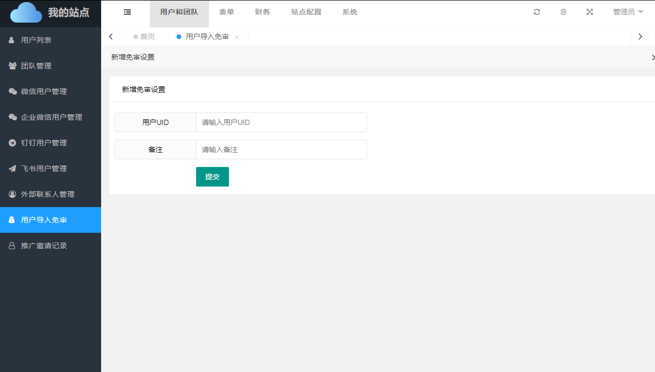 如私有云后台未开启短信验证,或企业内部要求禁止普通账号注册,可以使用用户导入免审,指定的团队在通讯录中以手动添加成员或批量导入成员时,无需手机号验证。