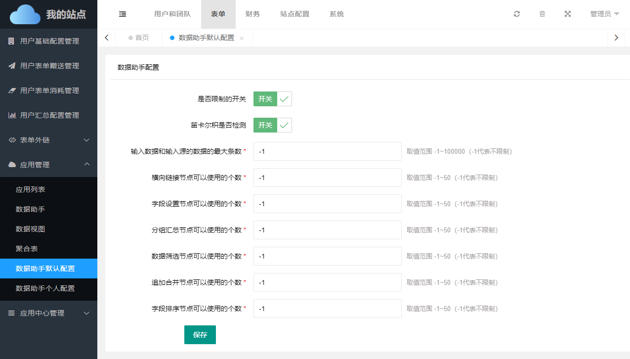 数据助手的配置分为默认配置和用户单个人设置,如不存在个人配置,则用户的配置数量按照默认配置执行。