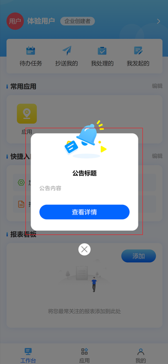 设置公告后,在用户登录后,会显示对应的公告信息。