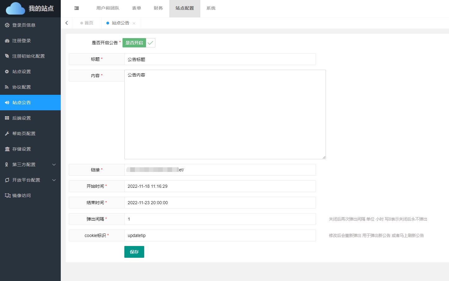 • 弹出间隔: 用户关闭公告后,再次弹出的时间间隔[单位:小时]
