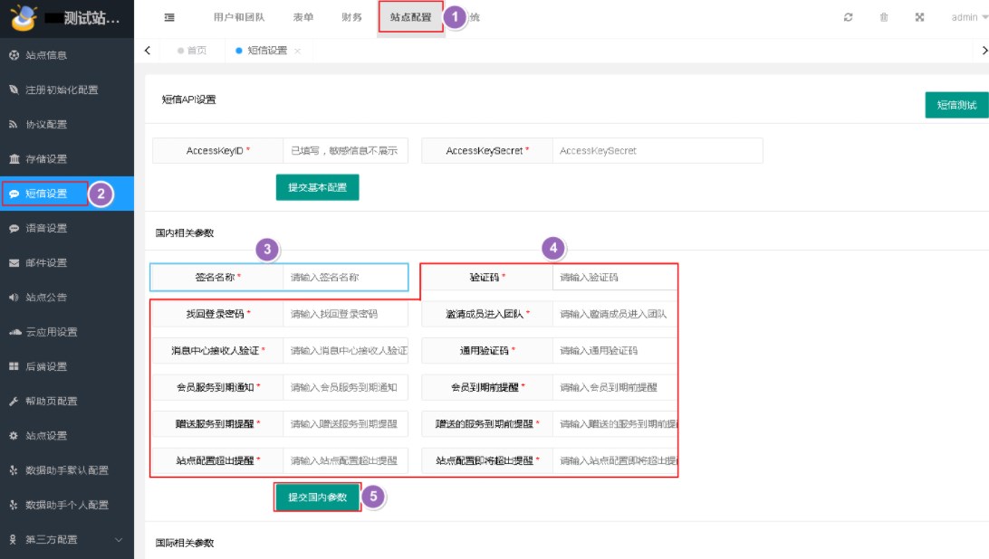 站点->短信设置->短信API设置 设置 签名 和 各种短信模板