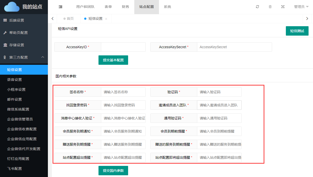 获取之后,在站点->短信设置->短信API设置 内填写 AccessKey ID和AccessKey Secret