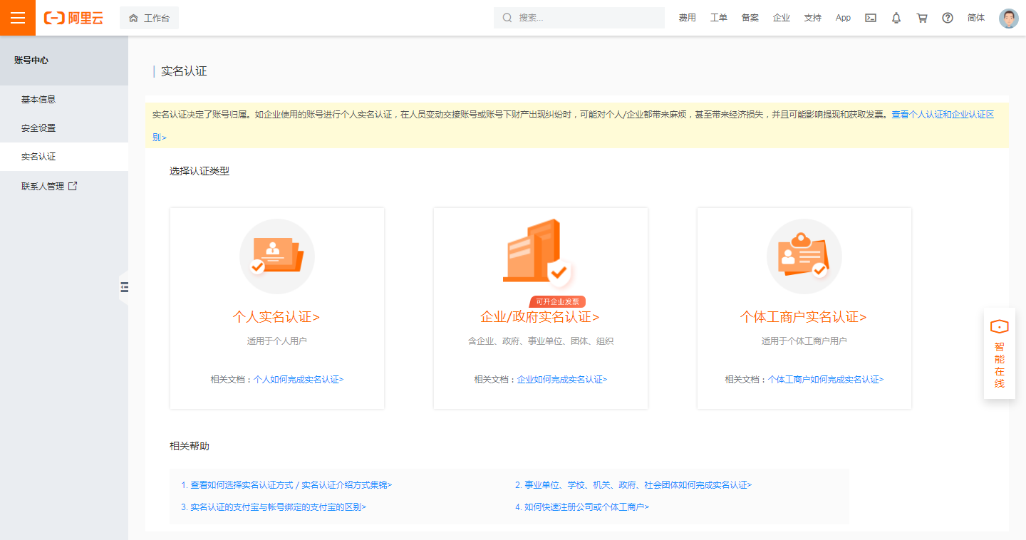 2. 进行实名认证,这里请注意选择认证模式 企业模式才可以开通短信服务