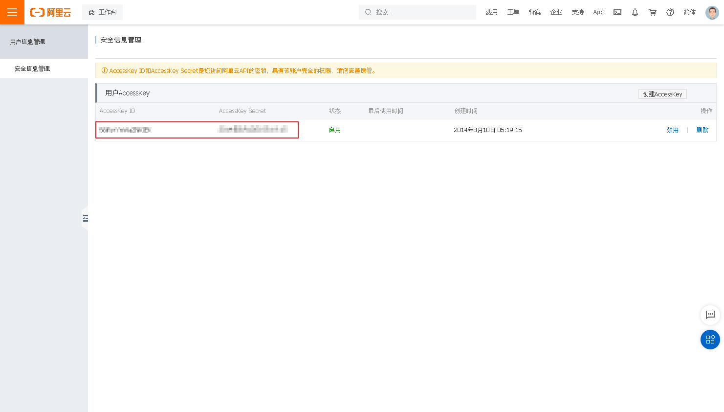 5. 获取AccessKey。具体操作,请参见创建AccessKey ID和AccessKey Secret