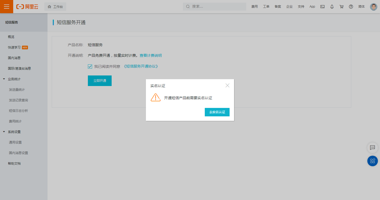 4. 开通短信服务。具体操作,请参见开通短信服务