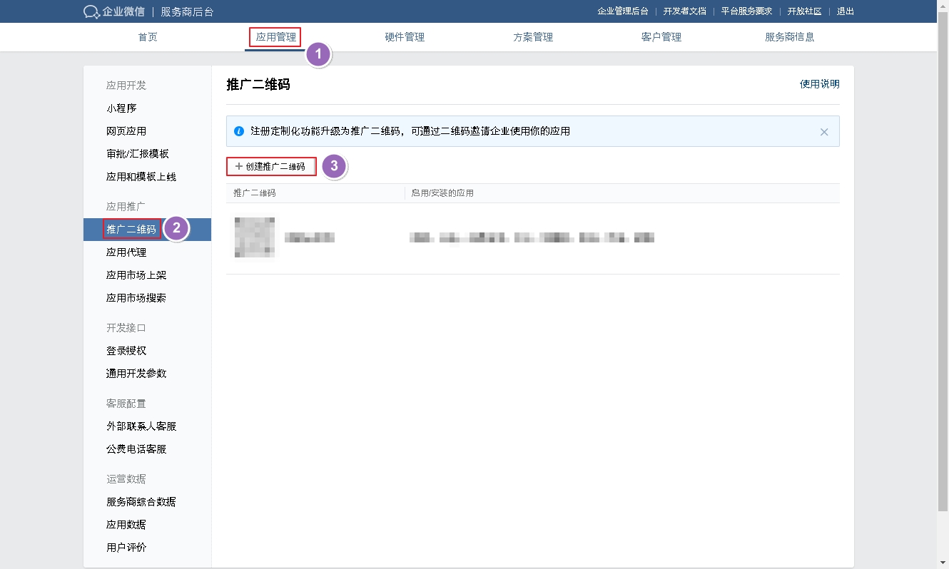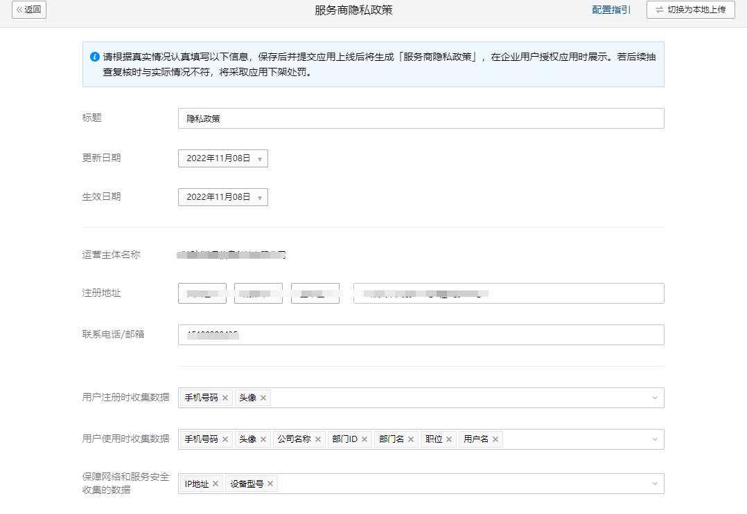 【应用开发】->【网页应用】,进入新添加的应用,找到服务商隐私政策,点击上传