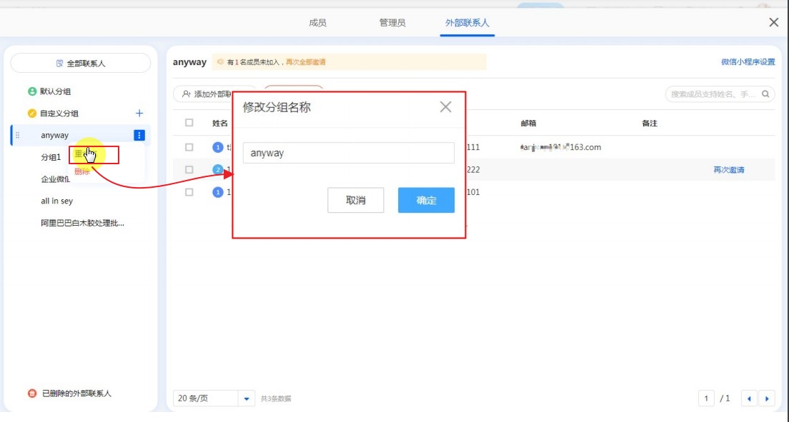 当自定义分组内无外部联系人时,可以删除该分组。