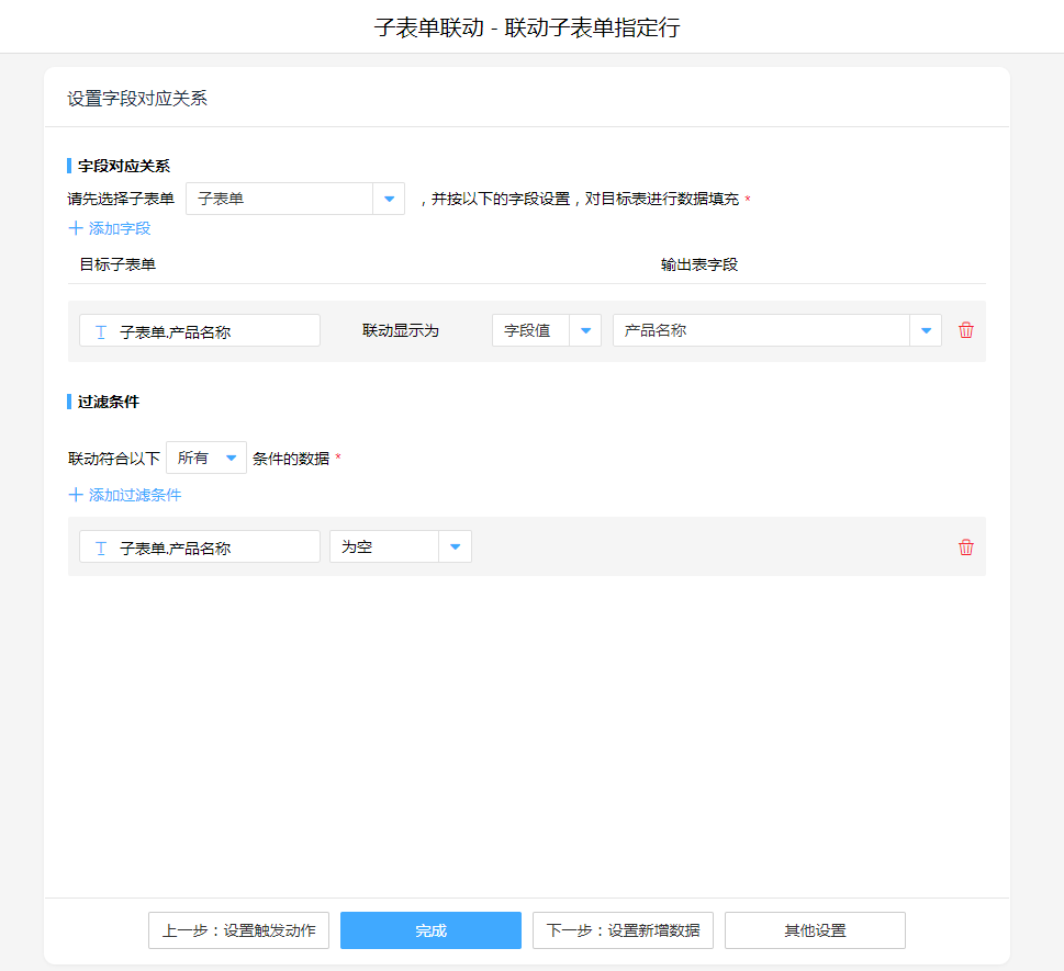子表单联动,操作模式选择"联动子表单当前行",设置联动对应关系。其中子表单选择需要添加数据的目标子表单,字段与过滤条件可按照实际情况进行设置。