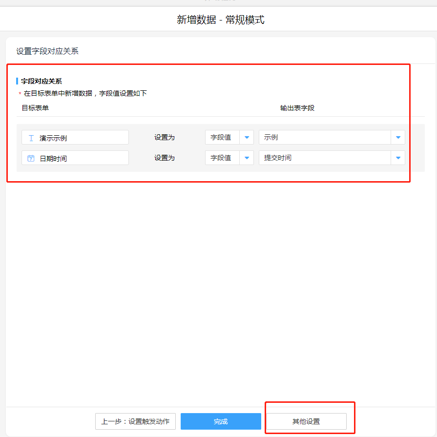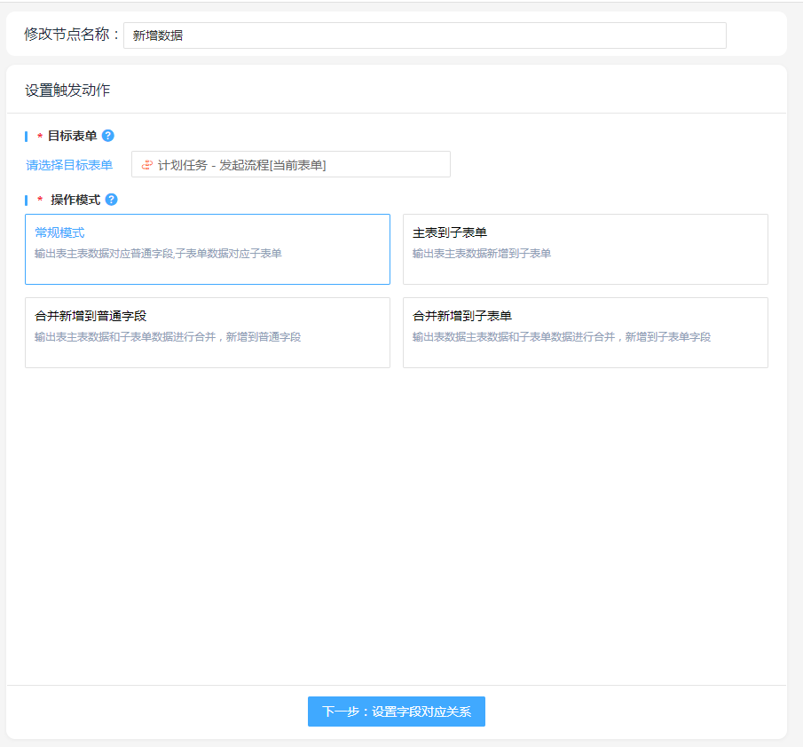 新增数据,操作模式按照实际情况进行选择,并设置字段对应关系
