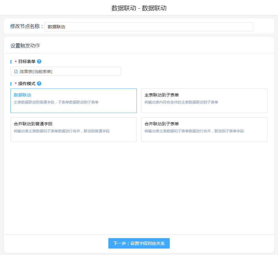 1. 添加执行动作数据关联,将两表字段进行联动。