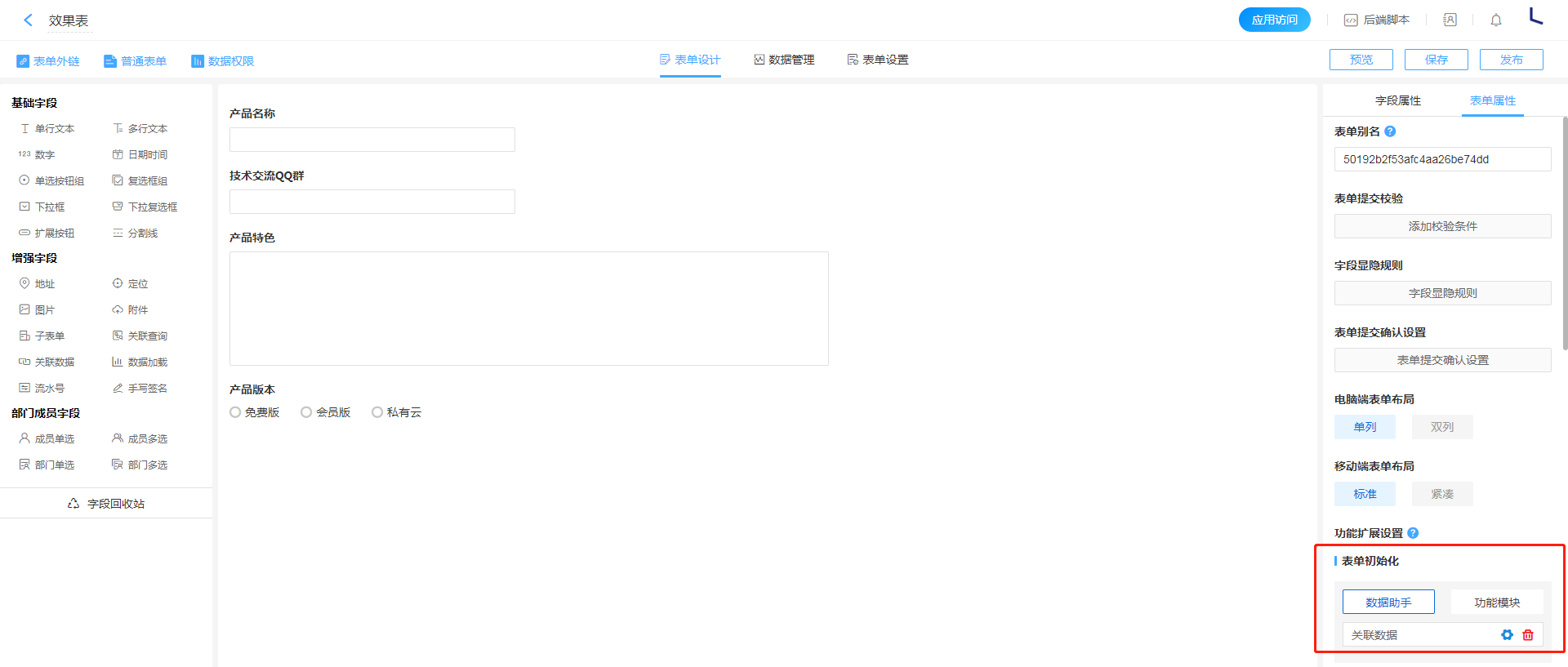 1. 进入表单属性的表单初始化数据助手配置页面。