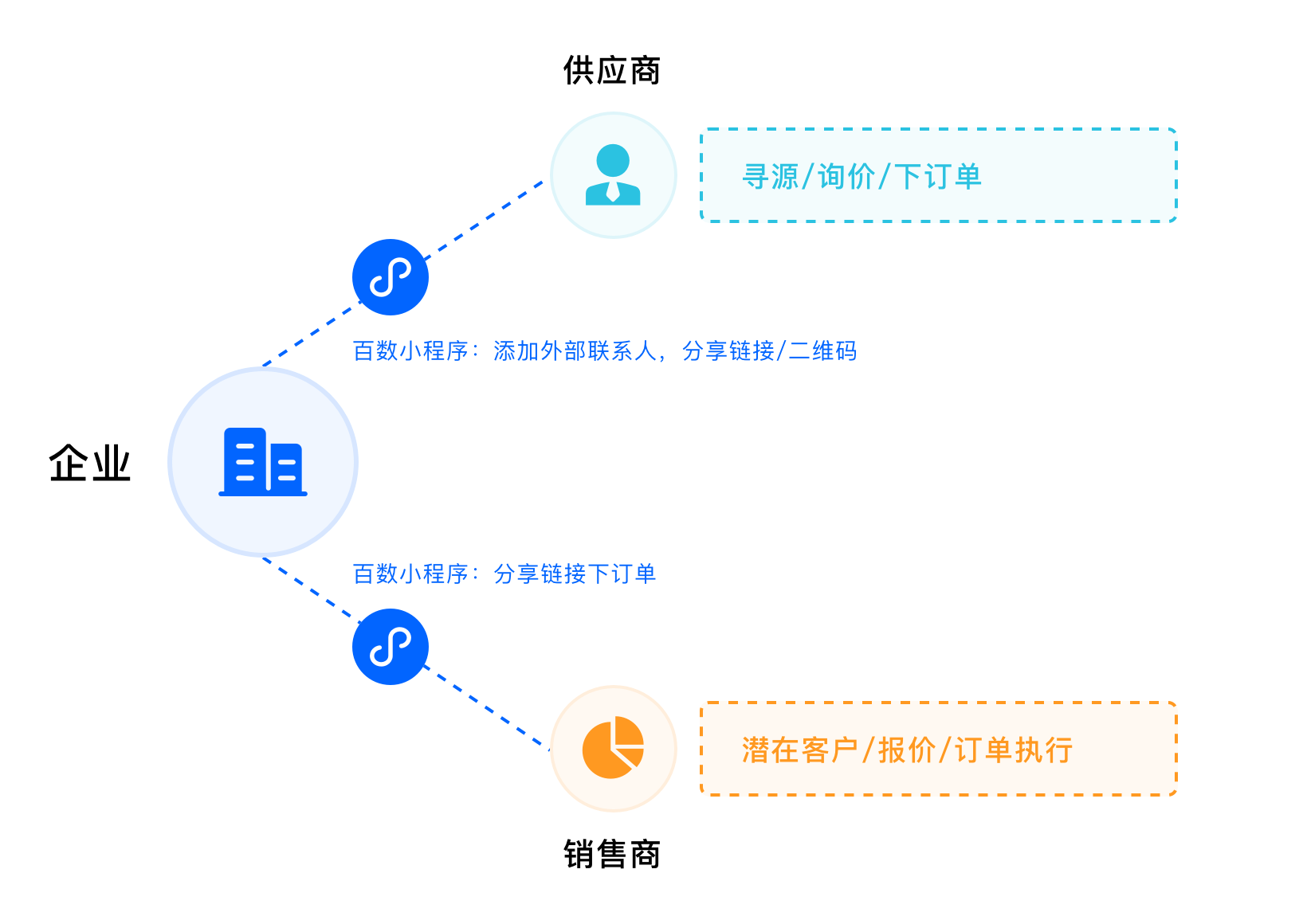百数在电商领域具备丰富的项目经验,基于供应链上下游协同的应用需求,建立以企业为核心的上下游垂直一体化产业链布局,解决了多家企业供应链协同的难题。一般平台的上下游互联,企业与企业之间的连接过程需要跳转7-8个步骤,操作较为复杂。如果需要链接平台外的企业,还需要借助excel导入外部通讯录进行联系人设置,达不到便捷互联协作的效果,而利用百数小程序只需要1-3个步骤就可以轻松实现一键互联。