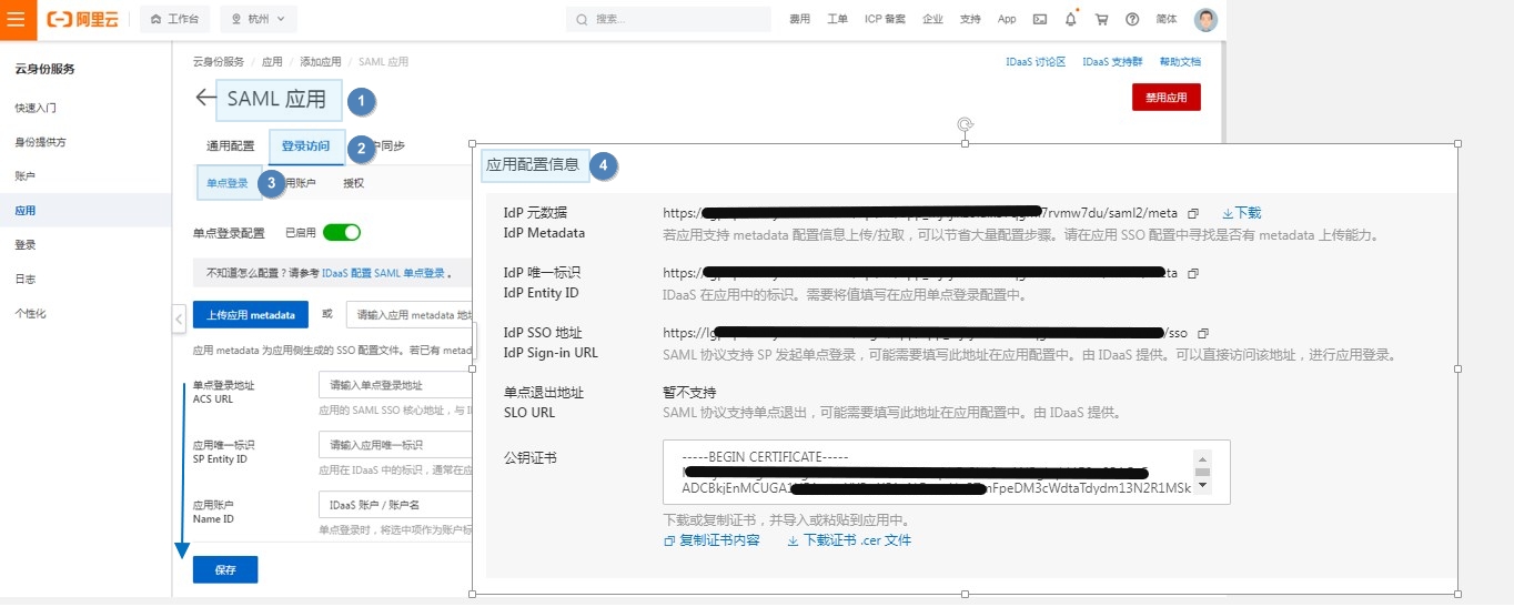 • IdP公钥:填入阿里云SAML应用>>应用配置信息>>公钥证书(Certificate)处的内容