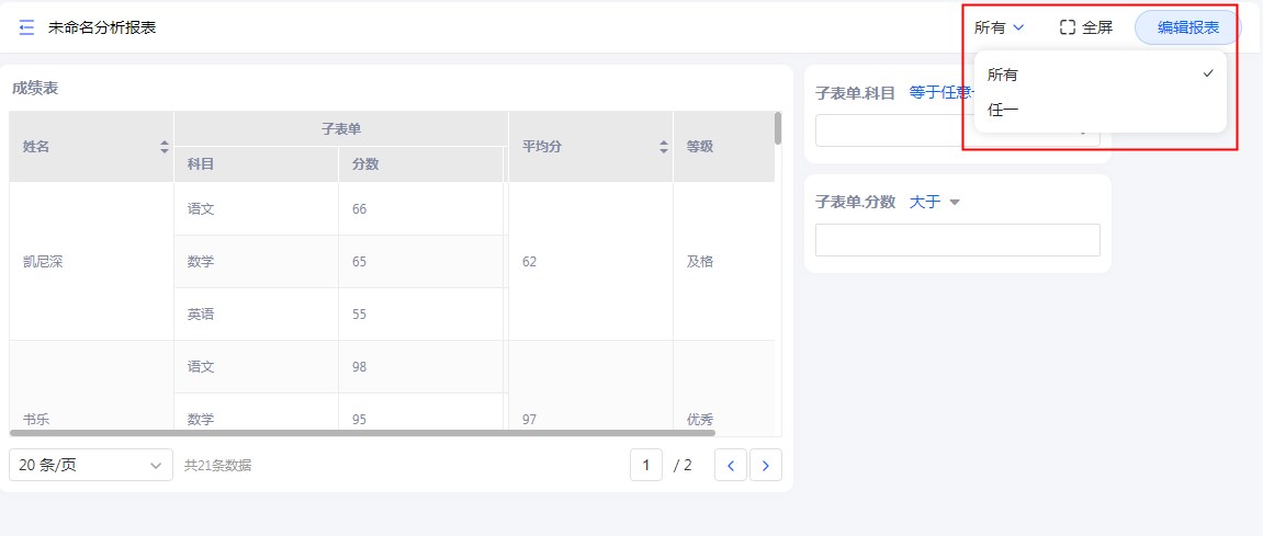 • 当多个筛选条件时,可以自定义满足所有/任一筛选条件来筛选数据,满足不同场景的筛选需求。