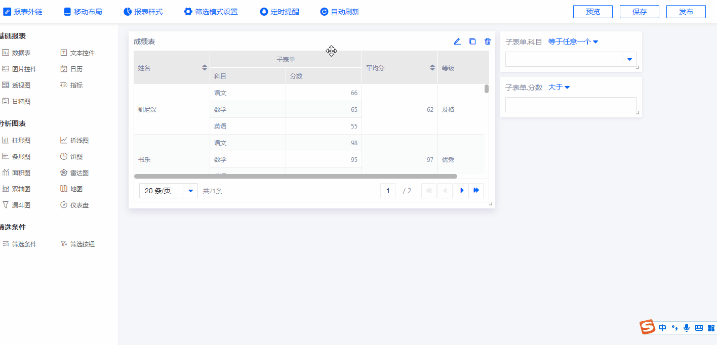 • 设置满足所有条件,查询科目等于数学,且分数等于100的数据。查询结果如下: