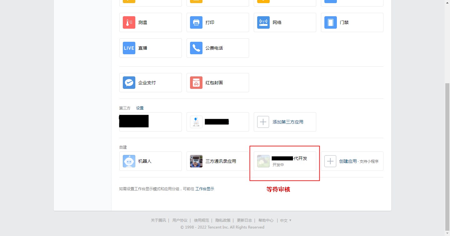 授权提交后,需要企业微信官方审核,此时可以看到代开发应用是开发中状态。