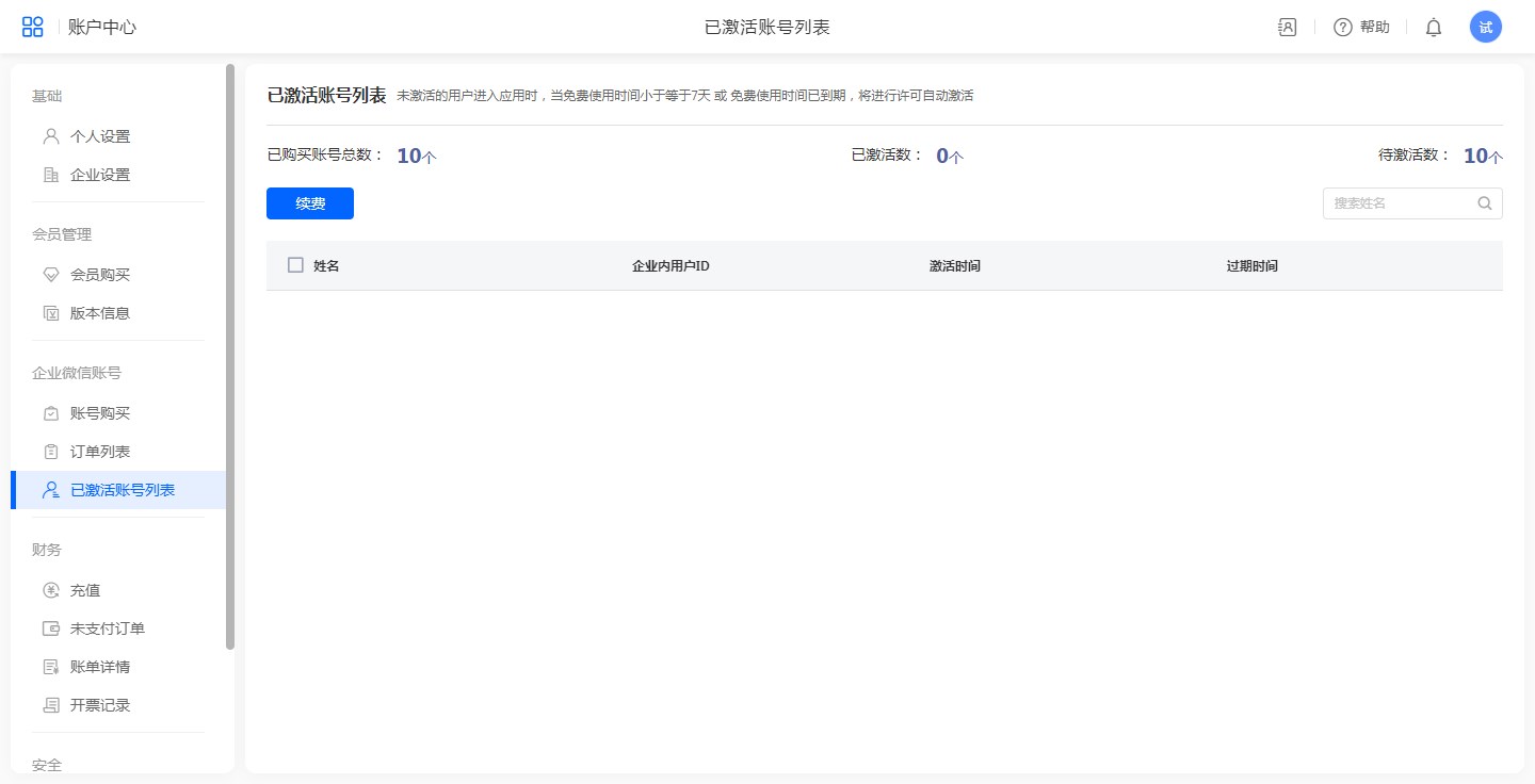 第一步:在[企业管理]->[企业微信账号]->[账号购买]下,输入数量和时长,确认购买。