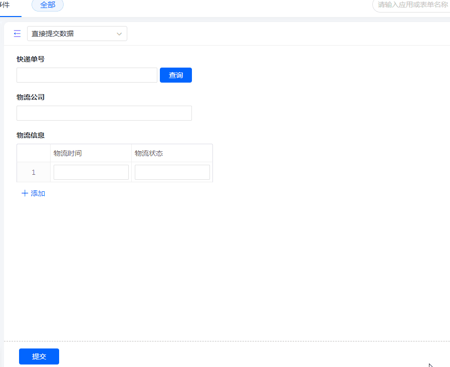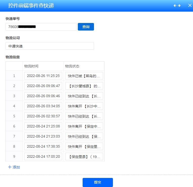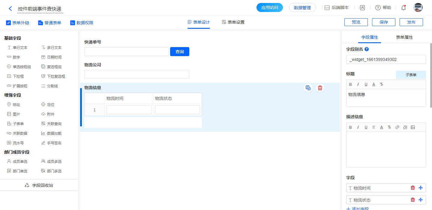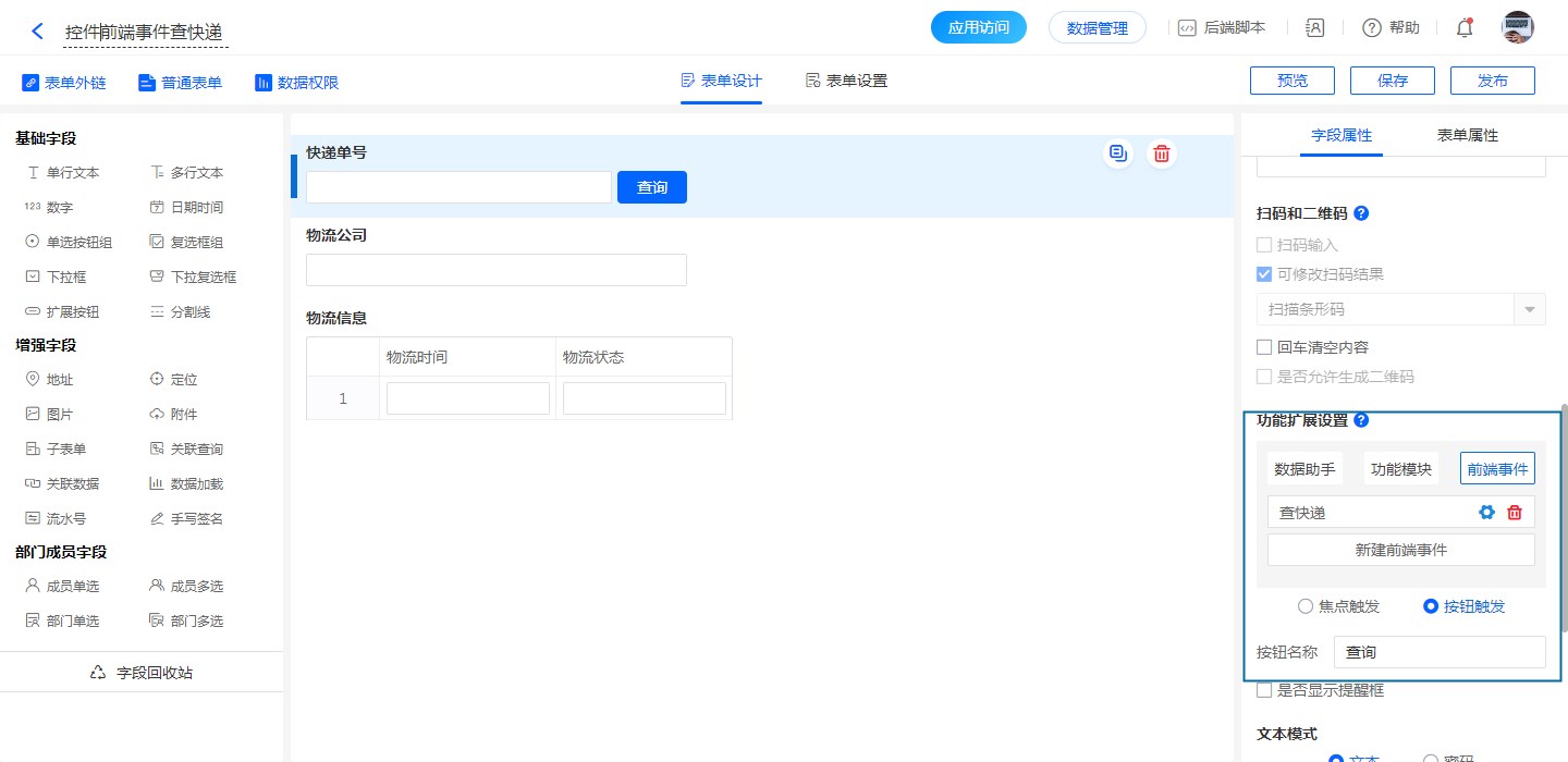 表单设计页选择 [快递单号] 字段,在 [字段属性]>>[功能扩展设置],选择[前端事件],新建前端事件。