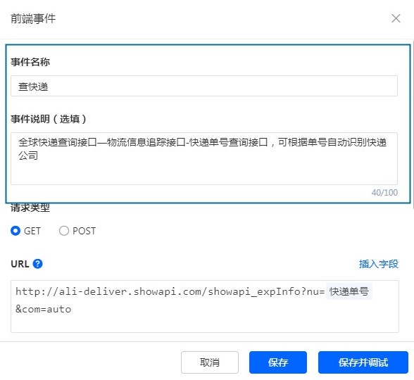 添加好前端事件后,首先设置前端事件的基础信息,即事件名称和事件说明,用于区分前端事件: