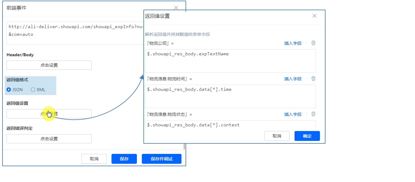 • 返回值设置页面,添加 [物流公司]、[物流信息.物流时间]、[物流信息.物流状态]字段为其设置返回值: