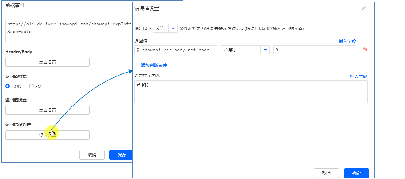 根据接口返回的错误码,我们可以设置返回值错误判定,当返回判定错误时弹出提示。