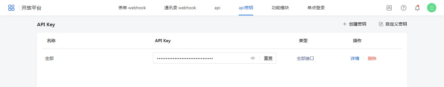 管理员登录系统,进入[开放平台]>>[api密钥],创建带有通讯录接口权限的密钥。