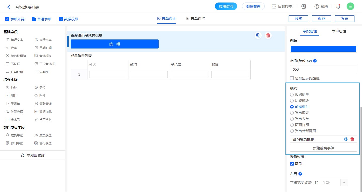表单设计页选择 [查询通讯录成员信息],在 [字段属性]>>[功能扩展设置],选择[前端事件],新建前端事件。