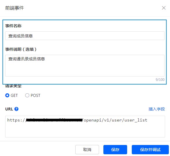 添加好前端事件后,首先设置前端事件的基础信息,即事件名称和事件说明,用于区分前端事件: