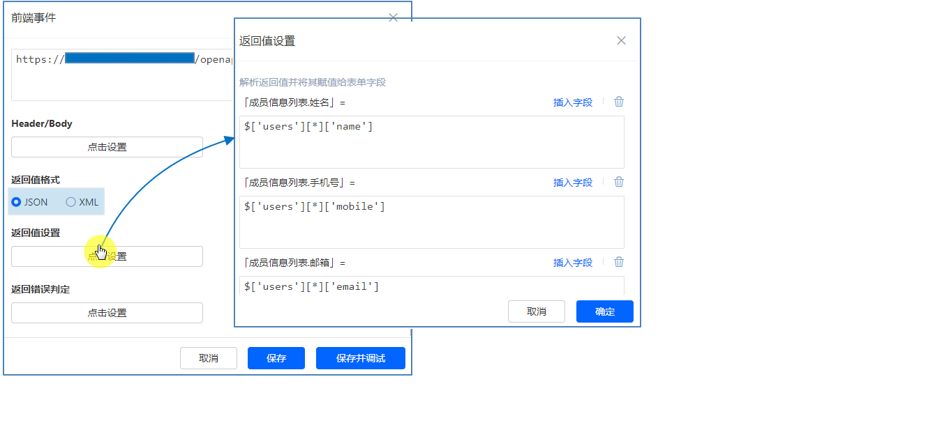 • 返回值设置页面,添加 「成员信息列表.姓名」、「成员信息列表.手机号」、「成员信息列表.邮箱」、「成员信息列表.部门」字段为其设置返回值: