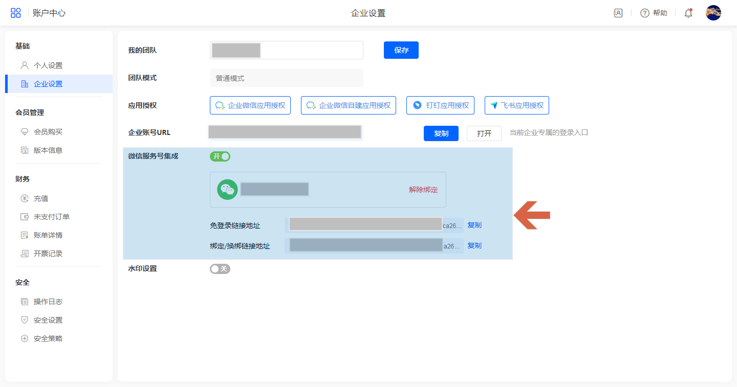 将这 2 条链接配置到自己的公众号号中,成员即可在公众号中完成平台的登录/绑定/换绑等使用。