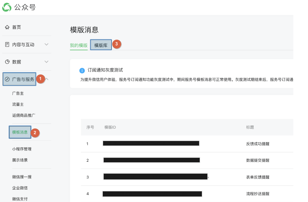 集成企业自有的微信服务号后,若想获取本平台消息通知,需要完成下文服务号模板消息的设置。