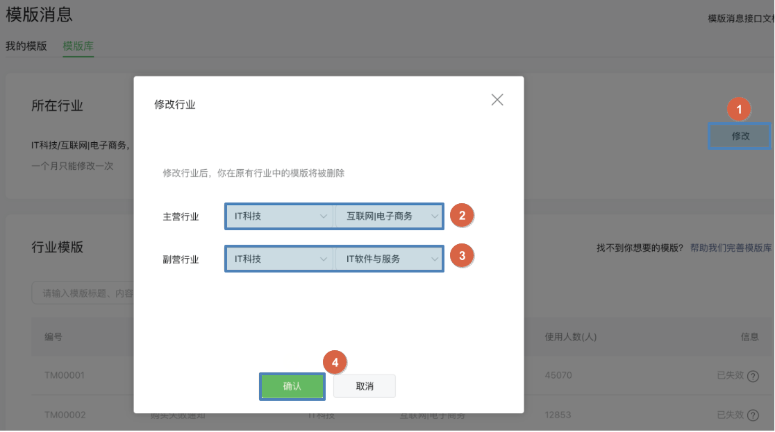 • 集成新的微信服务号后,会使用新微信的消息模板,会导致本平台原设置的自定义消息模板不再生效。