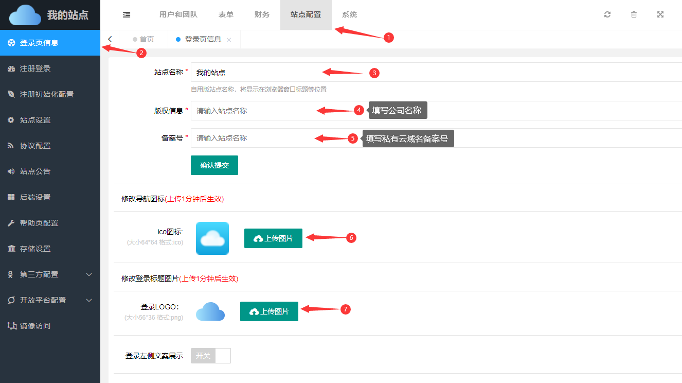 进入站点配置->登录页信息