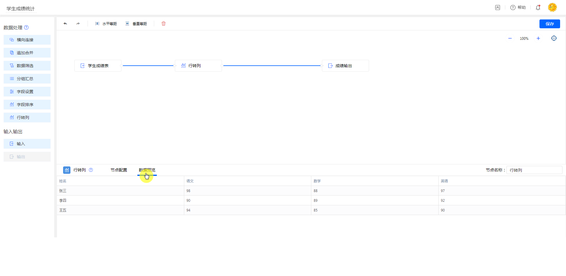 节点配置好后,点击 [数据预览] 可以查看行转列后的数据效果。