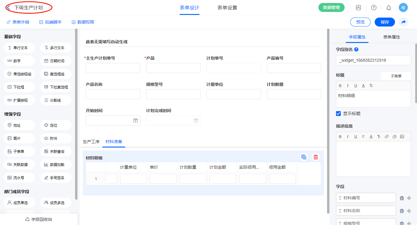 1)新增【主生产计划列表】报表,用基础报表【数据表】展示数据源为表单【生产计划】的数据;