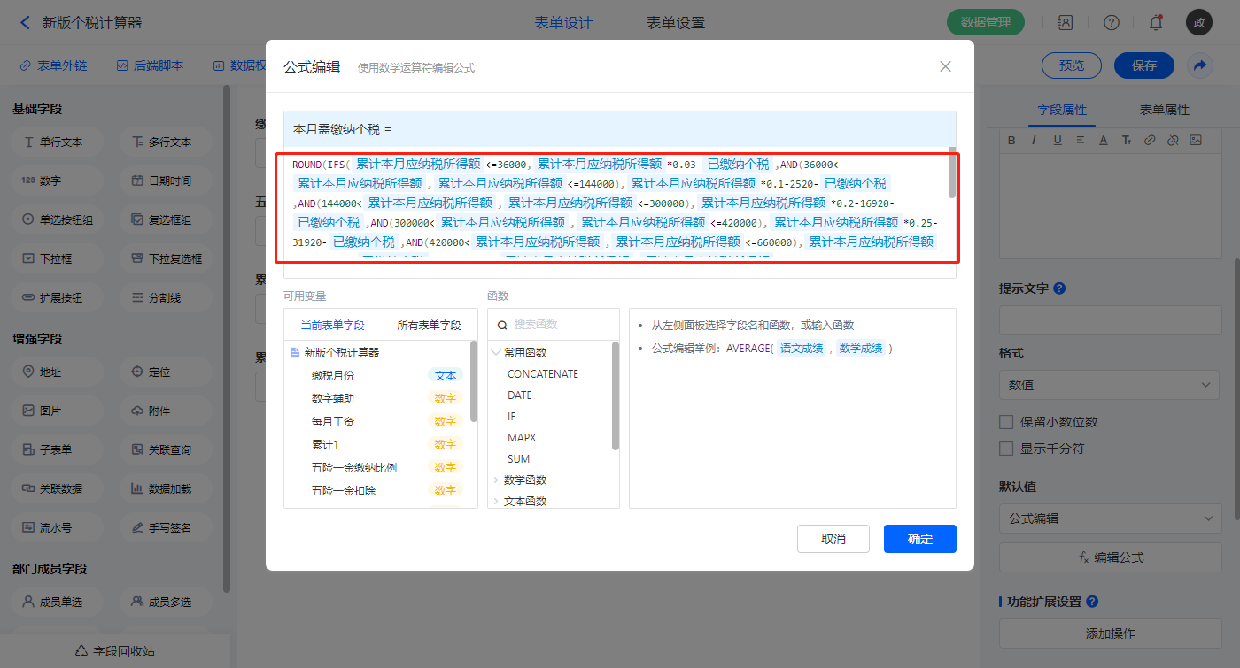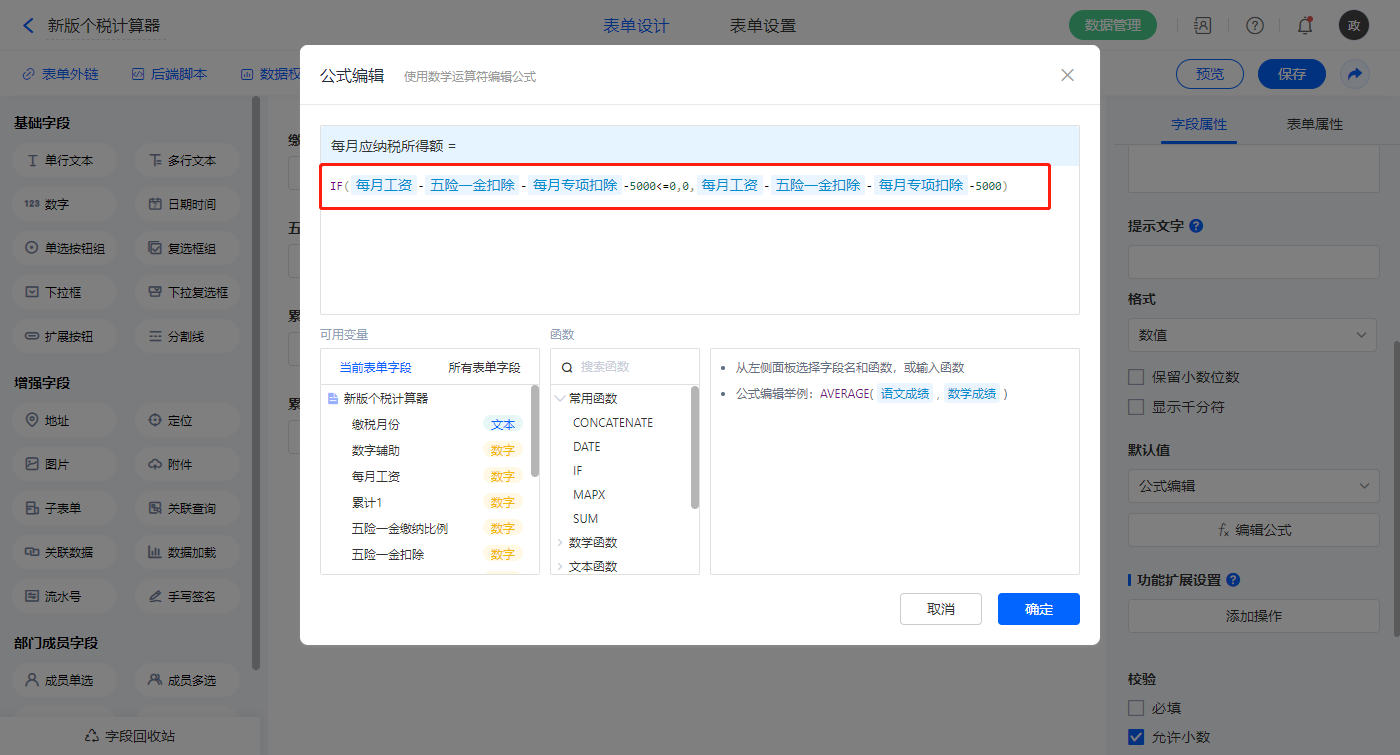 【本月需缴纳个税】字段,默认值选择公式编辑,如图设置公式;