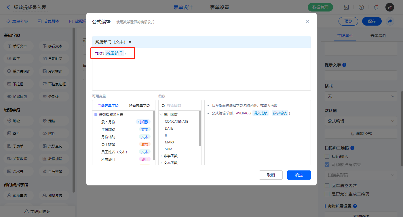 【所属部门(文本)】字段,默认值选择公式编辑,如图设置公式;