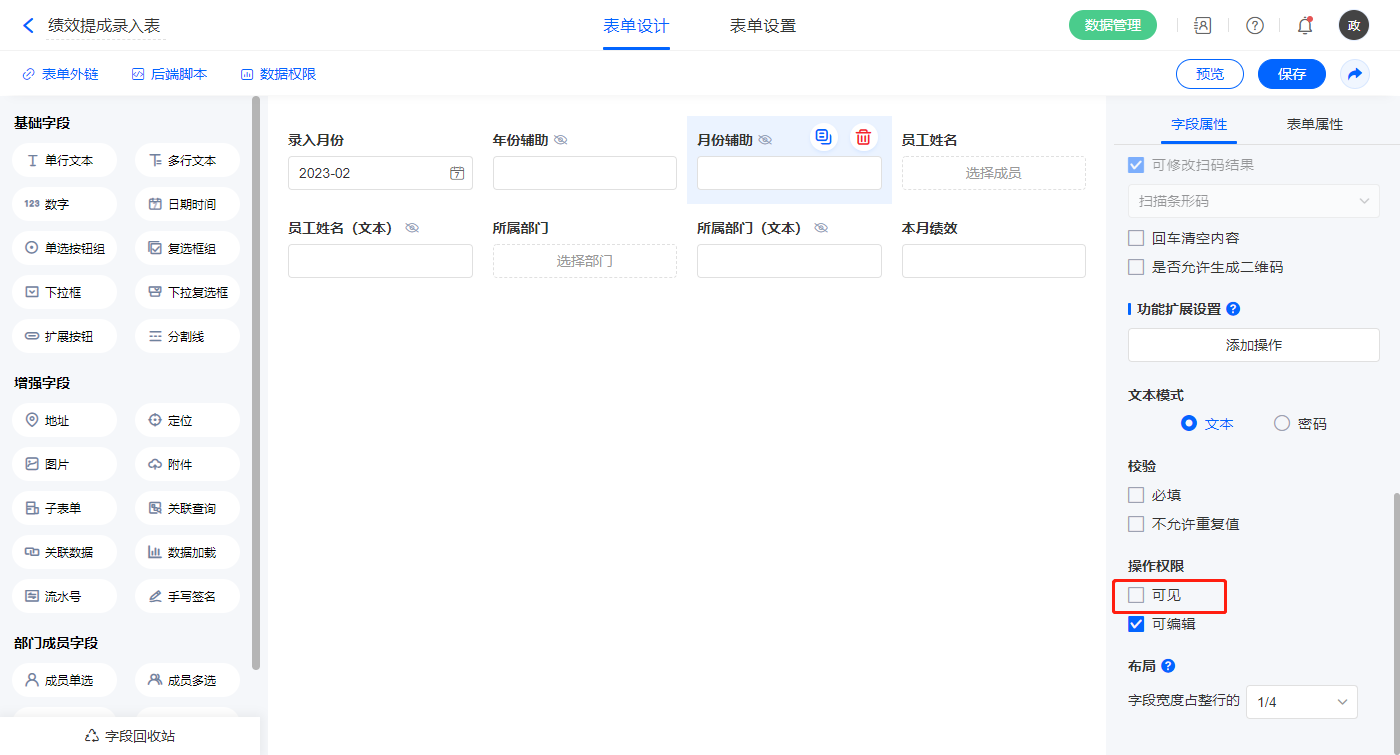 2)【年份辅助】、【月份辅助】、【员工姓名(文本)】、【所属部门(文本)】设置字段的操作权限为不可见;