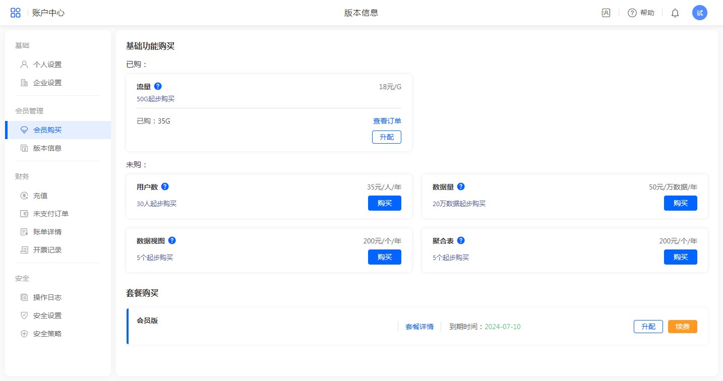 用户可在会员购买页面,可以选择购买基础功能(用户数、数据量、聚合表、流量、数据视图),也可以选择购买套餐。