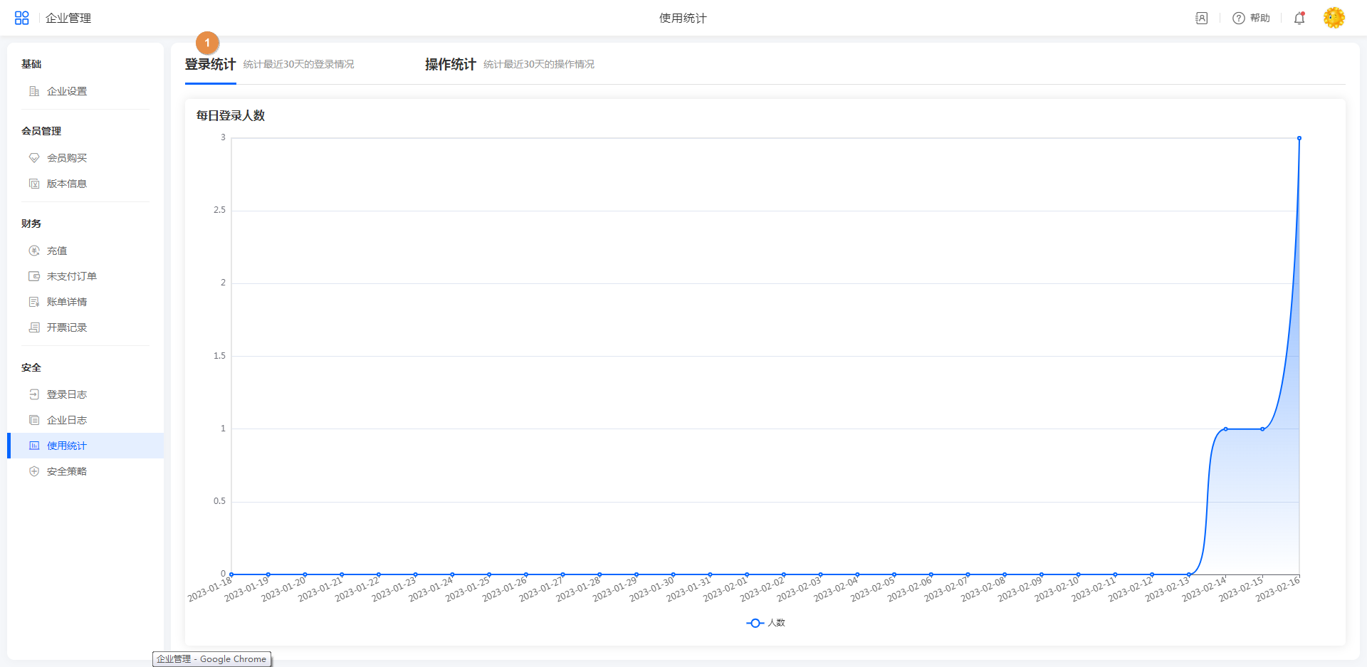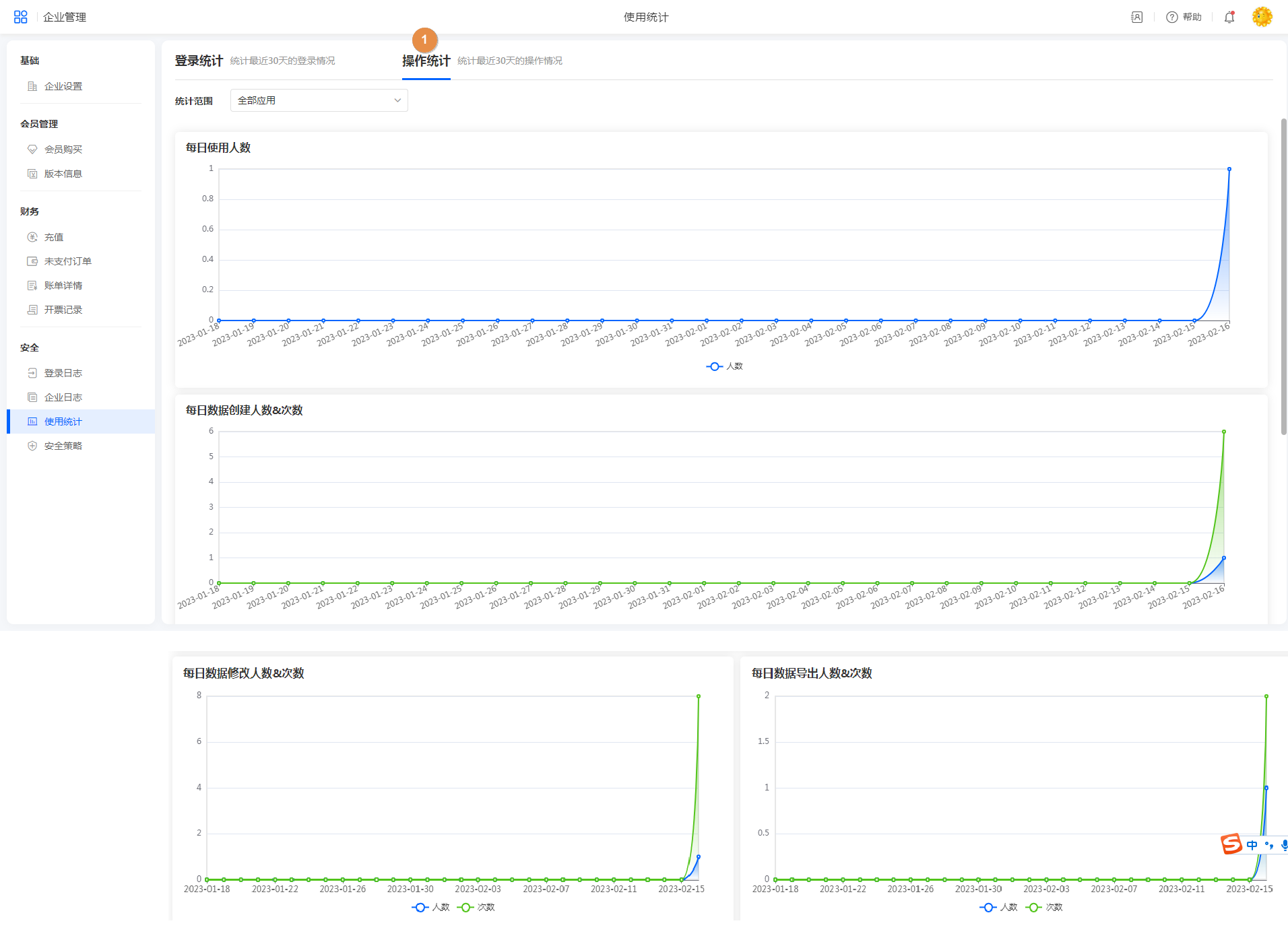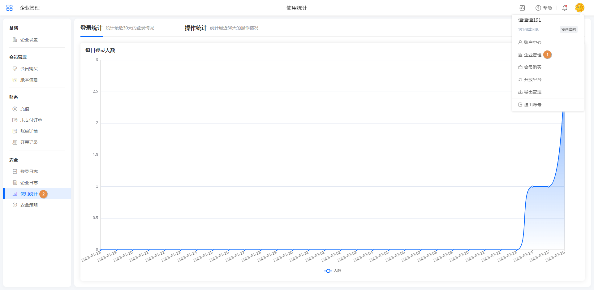 使用统计是对成员登录和操作的数据统计看板,包含登录统计和操作统计。