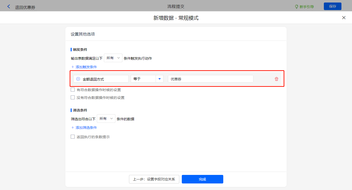 其他设置触发条件为【金额退回方式】等于优惠券,设置好点击【完成】并保存该数据助手;
