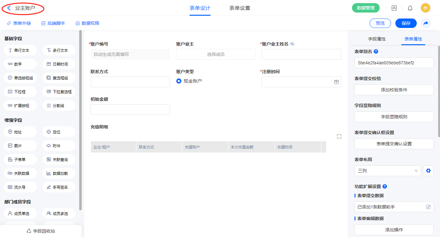 【账户充值】的菜单栏,操作模式设置为弹出表单【账户充值】;