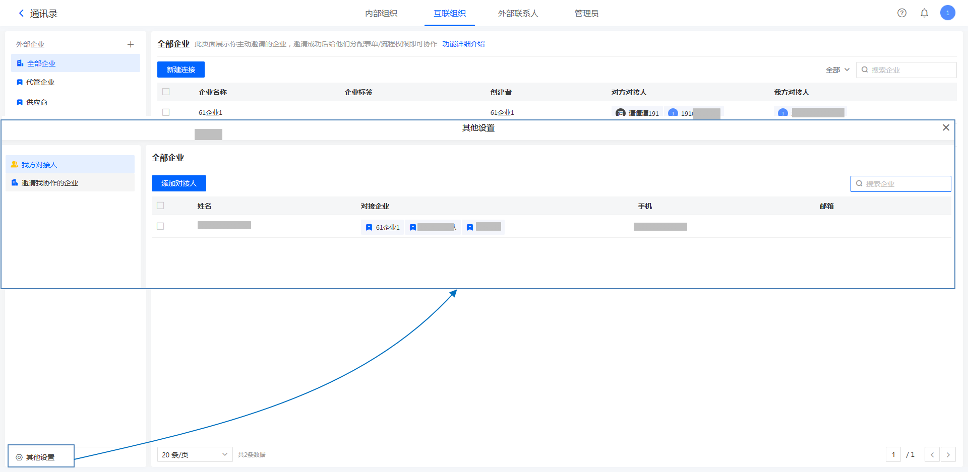 • 对接全部企业:可以对接所有外部组织的跨组织协作业务,后续添加的互联组织也自动成为该对接人的对接企业
