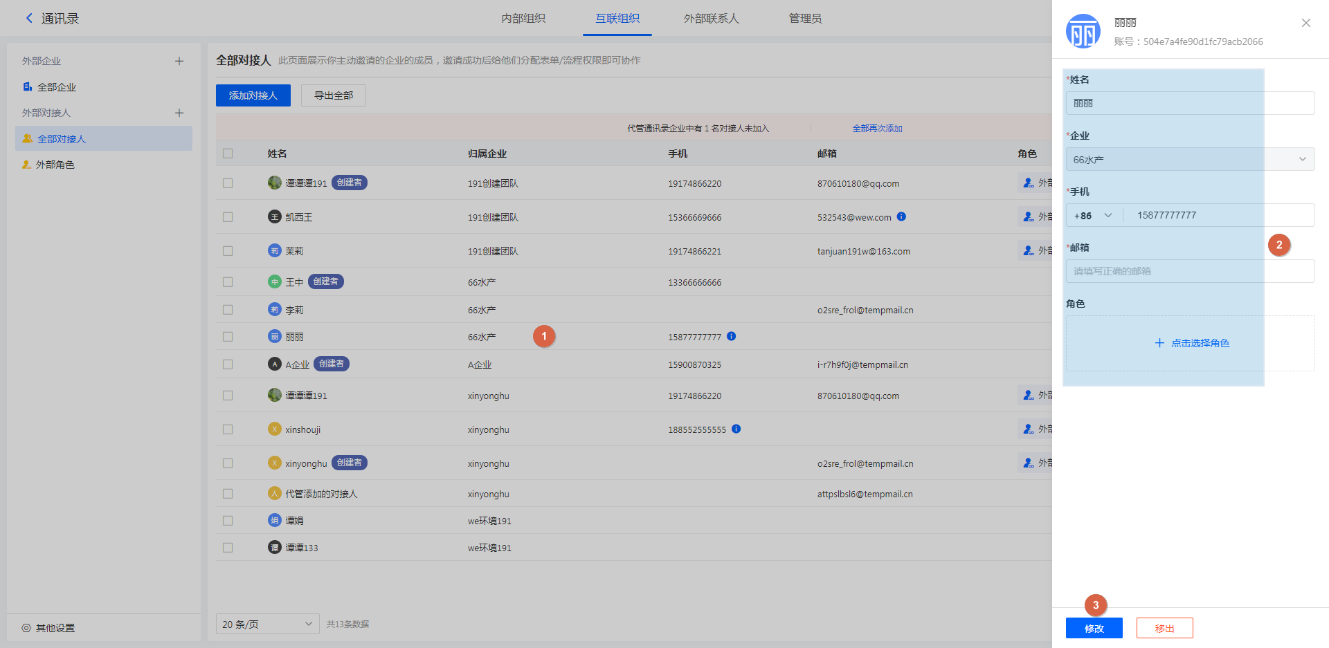 为角色添加对接人,可以是不同企业的不同对接人。如下图所示: