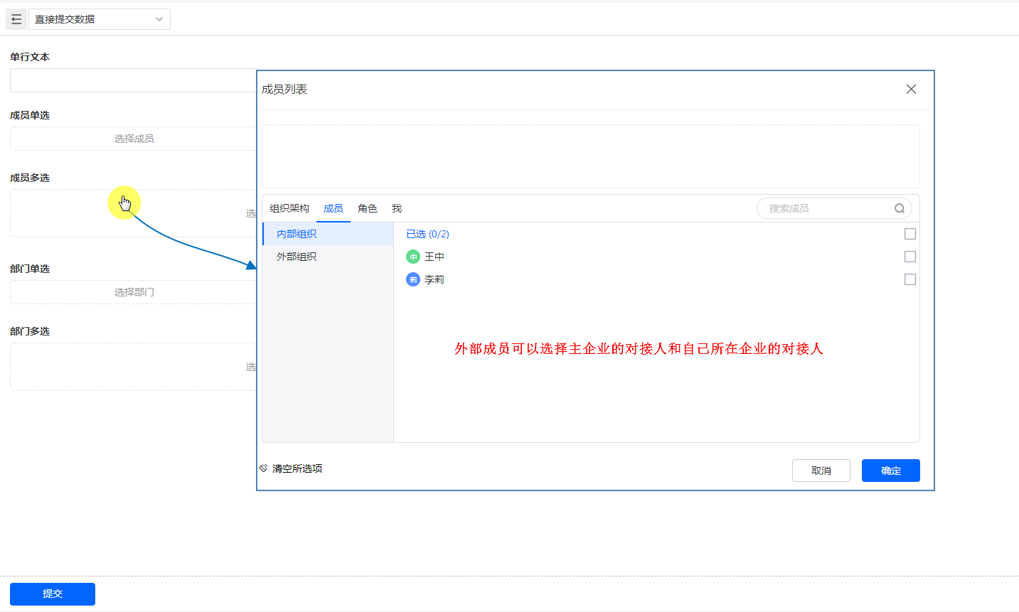 内部组织和外部联系人的成员,如果有对接的企业,可以选择对接企业的组织和成员。