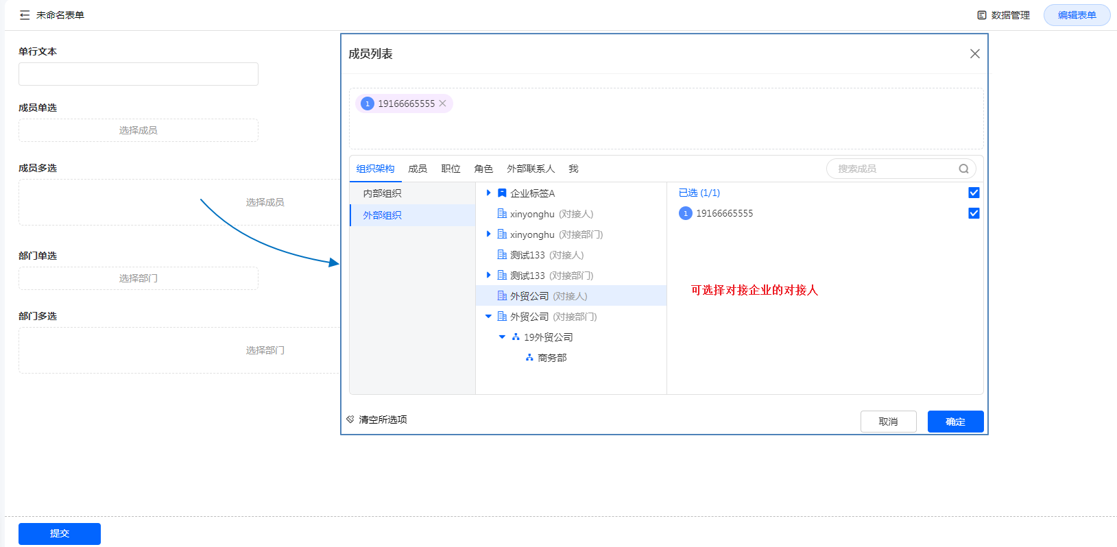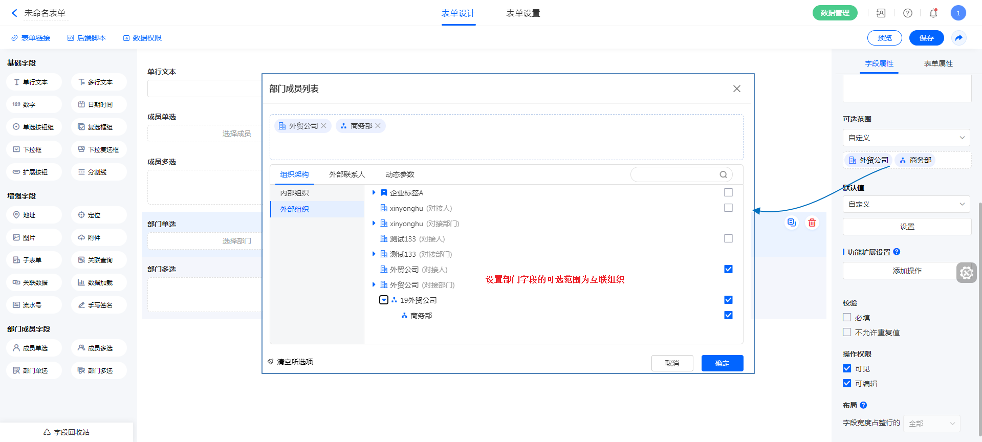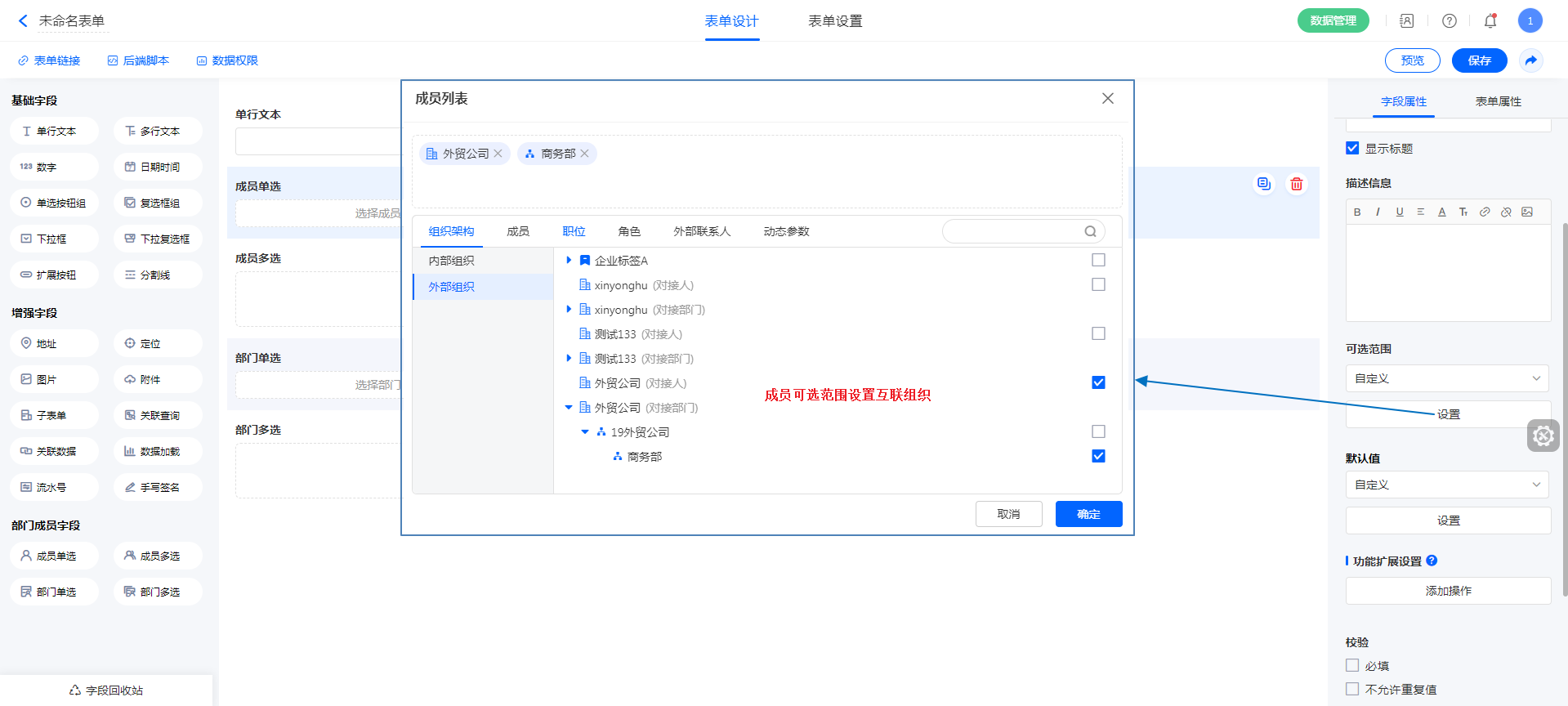 但表单中设计了成员或部门字段时,那么在设计或者使用表单时,可以选择互联组织或成员。