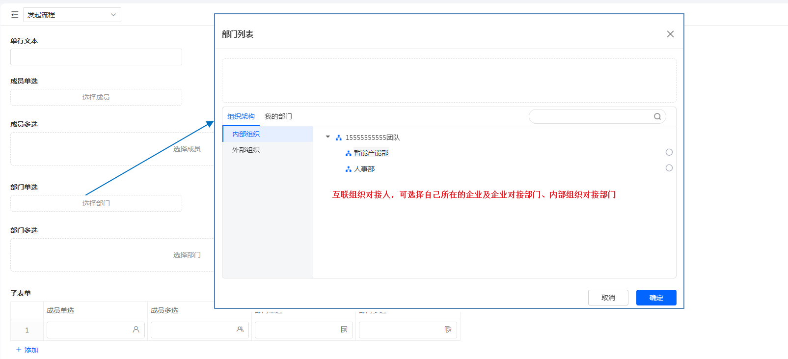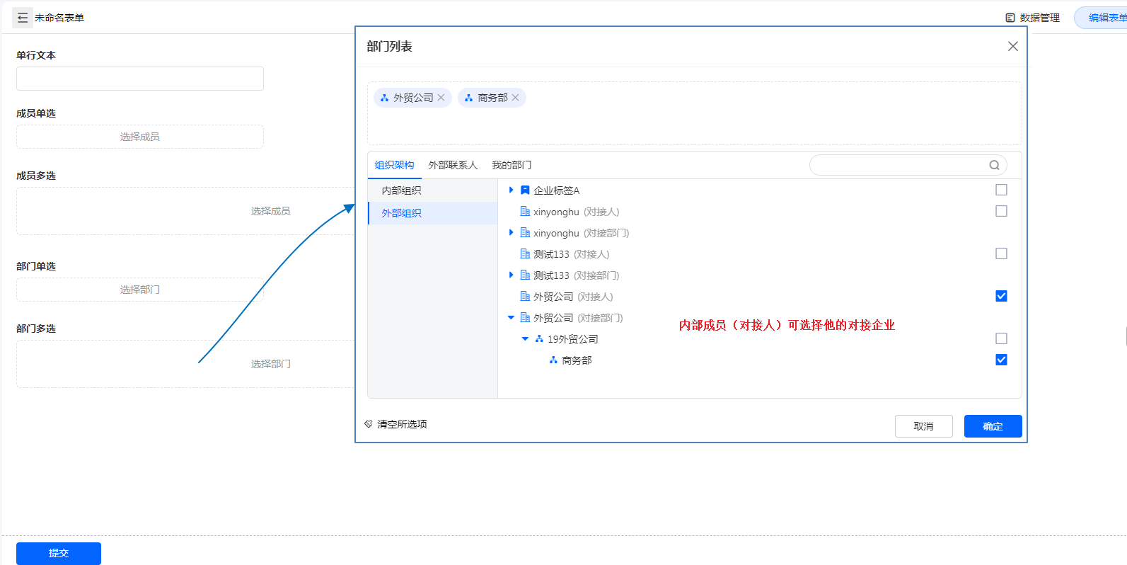 互联组织在我发布的表单的部门成员字段中选择部门或者成员时,具有以下特性: