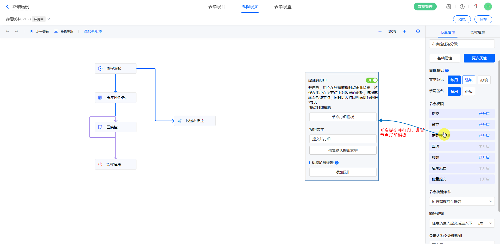第一步:进入流程设计页面,流程节点开启提交并打印,并配置打印模板。